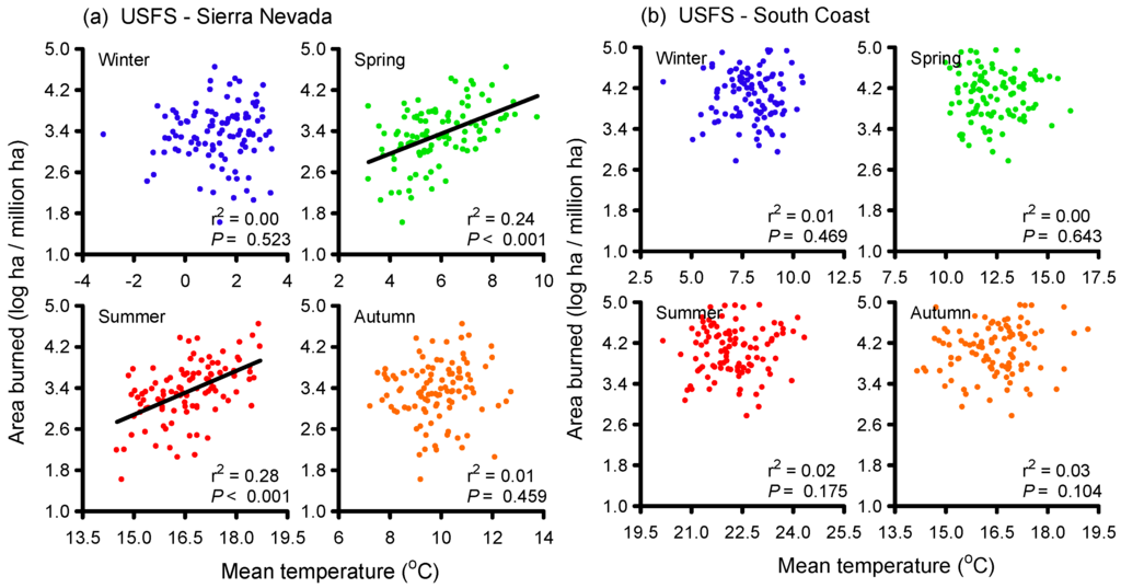 Using California as an example, consider US Forest Service (USFS) lands, which cover an extensive latitudinal range. Here temperatures are inversely correlated with latitude; r2 = 0.68, 0.59, 0.69, 0.73, p < 0.001, for winter, spring, summer and autumn, respectively, on USFS lands in California [8]. In addition, annual area burned is inversely correlated with latitude; r2 = 0.15, p < 0.001. Thus, before investigating temporal patterns of how fire activity varies with climate, we need to appreciate there is significant spatial variation as well as temporal variation. In our studies of fire-climate relationships in California we have investigated these relationships within climatically homogeneous divisions as defined by NOAA [33], focusing on the main fire-prone landscapes in the state. At this scale we find that fire-climate relationships are remarkably different from one climate division to another. For example, a 104 years of records reveal highly significant correlations between temperature and area burned in the Sierra Nevada (Figure 2a), but not in the southern part of the state (Figure 2b). In addition, where there are significant relationships (Figure 2a), winter and autumn temperatures are not associated with annual area burned, whereas spring and summer temperatures are.