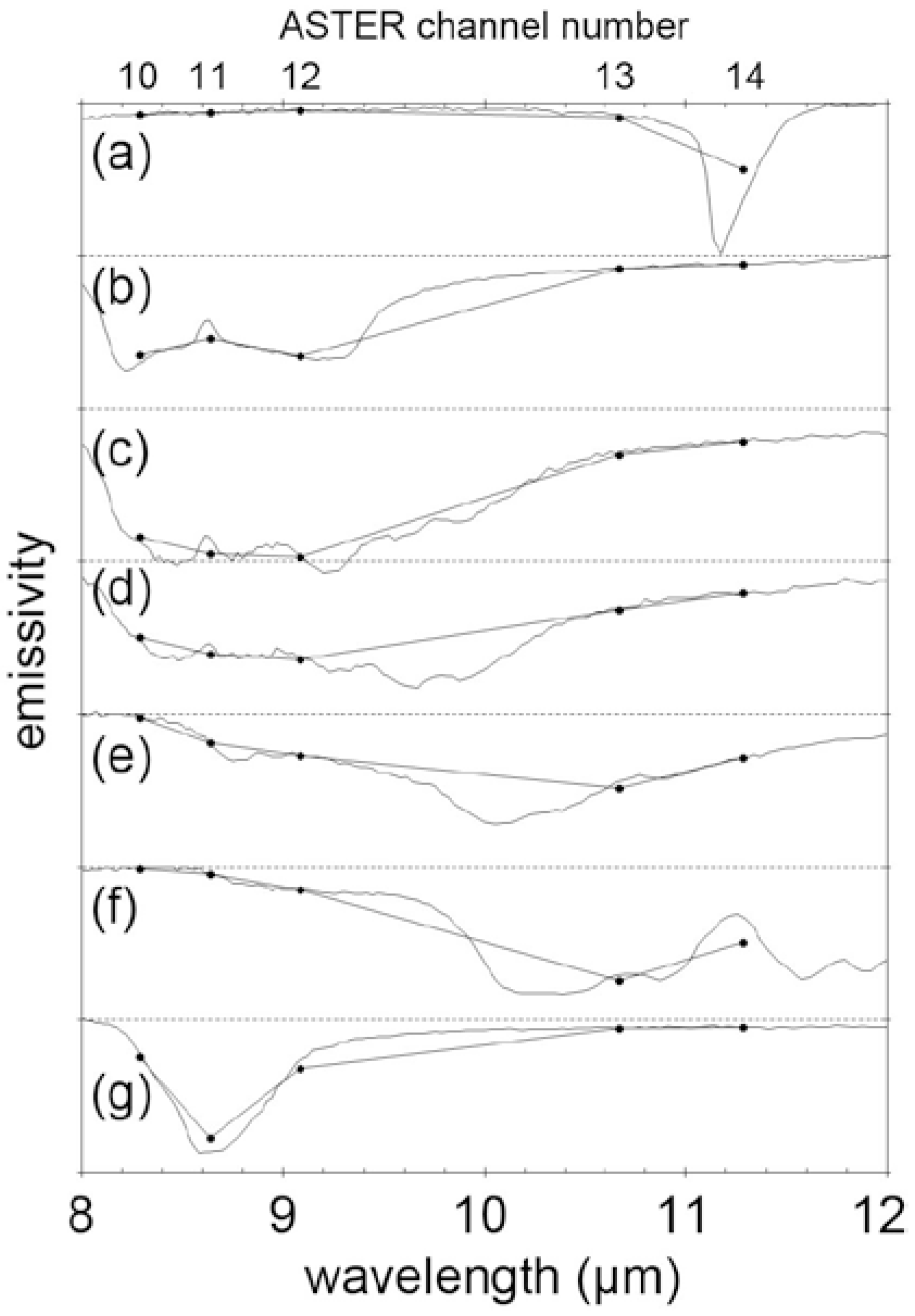 - Ninomiya, Y.; Fu, B.; Cudahy, T.J. Detecting lithology with Advanced Spaceborne Thermal Emission and Reflection Radiometer (ASTER) multispectral thermal infrared “radiance-at-sensor” data. Remote Sens. Environ. 2005, 99, 127–139. [Google Scholar] [CrossRef]
