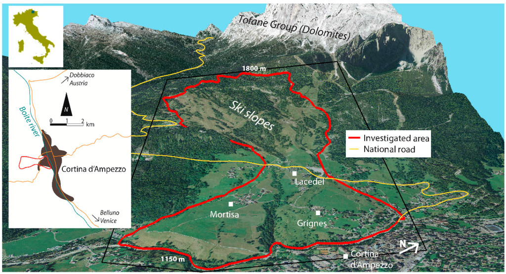 Landslide hazard zonation is fundamental to manage urban expansion in mountain areas [1,2]. However, especially for slow and very slow movements [3], the procedure to follow is not defined a priori and has to be based on the integration of different techniques specifically chosen for the area under examination [4,5]. Nevertheless, slow and very slow moving landslides can still continue to damage buildings and infrastructures [6] and local authorities must be provided with sound landslide hazard maps to guarantee an appropriate degree of safety to properties and people [7]. When anthropic pressure is elevated, inaccuracy in the definition of landslide boundaries can also lead to a significant economic loss. This is particularly important in the prestigious location of the Cortina valley (eastern Italian Alps), in the heart of the Dolomites, a United Nations Educational, Scientific and Cultural Organization (UNESCO) world heritage site, where the prices of the apartment are about 10.000 €/m2 [8].