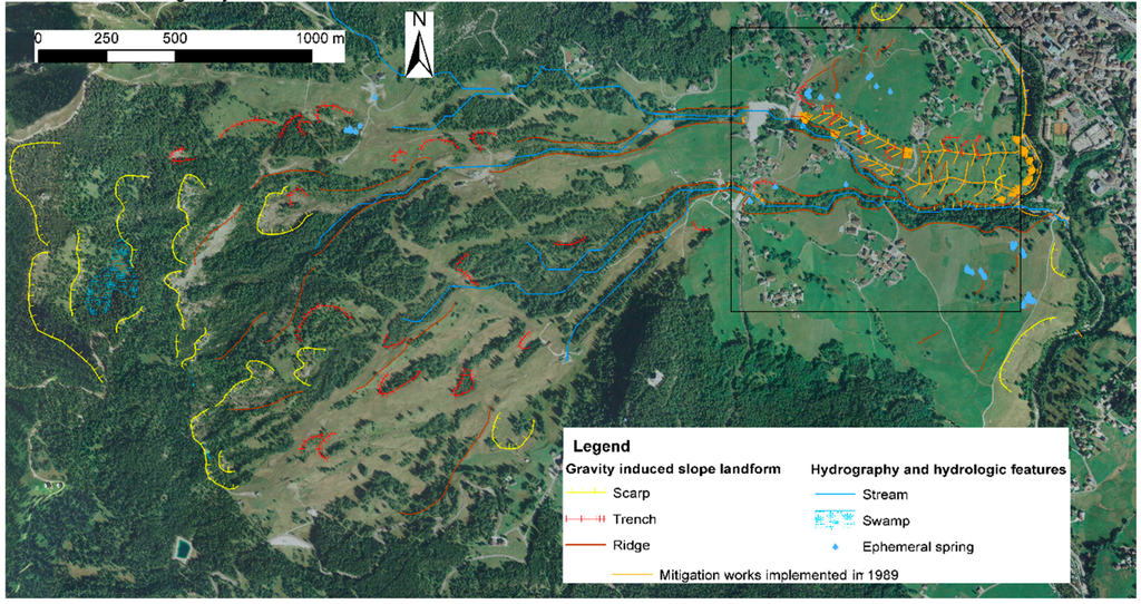 Geomorphological evidence in the Mortisa slope and location of the mitigation measures implemented in 1989. In black is the frame of Figure 3.