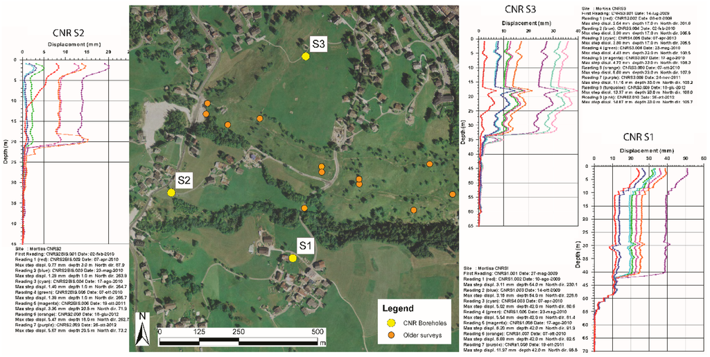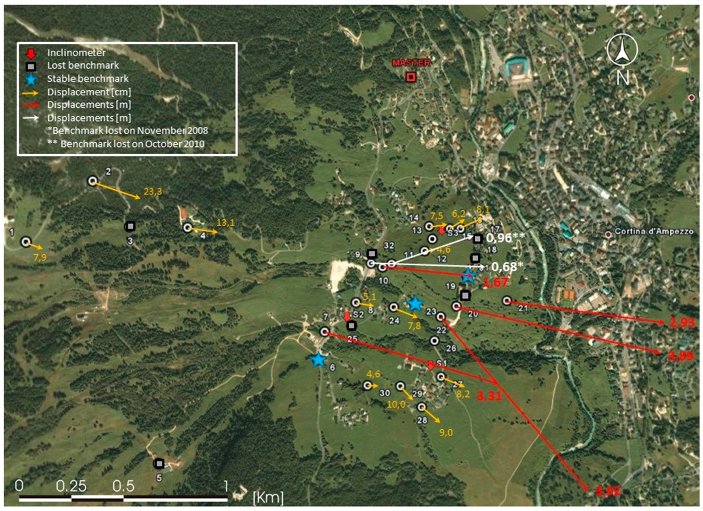 The integration of different techniques is effective as each method has its advantages and disadvantages. Photointerpretation and geomorphological survey allow comprehension of the distributed dynamic of the phenomenon, but do not quantify velocities, and sometimes areas with low activity may be undetected. GNSS surveys provide precise information on the displacement, but each survey is quite time-consuming and their results punctual. A-DInSAR too provides very detailed data on displacements, but the density of persistent scatterer interferometry (PSI) could vary greatly within different areas. Inclinometers are fundamental to the detection of the depth of the slip surface of a landslide, but they are expensive and difficult to install. The possibility to apply multitechnological techniques permits balancing each element’s limitations, and it also provides redundancy of data that could be extremely useful in complex environments.