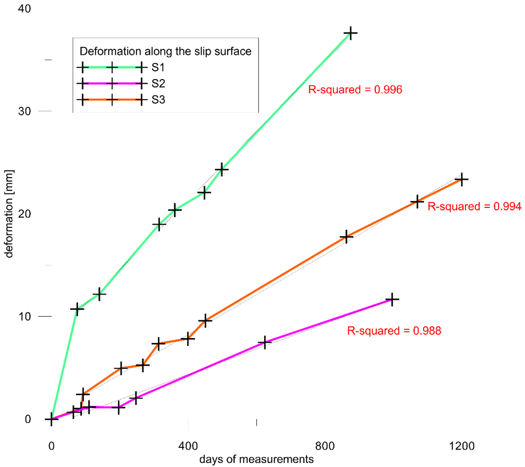 In Figure 4 the trends of the displacements along the slip surface for each of the three boreholes are presented. The first measures were discarded from the linear interpolations to avoid possible errors due to the consolidation of the soil after the installation. It is possible to appreciate that the trend of displacement is almost linear, i.e., velocity is constant, a typical behavior for the accumulation area of these types of landslides [21].