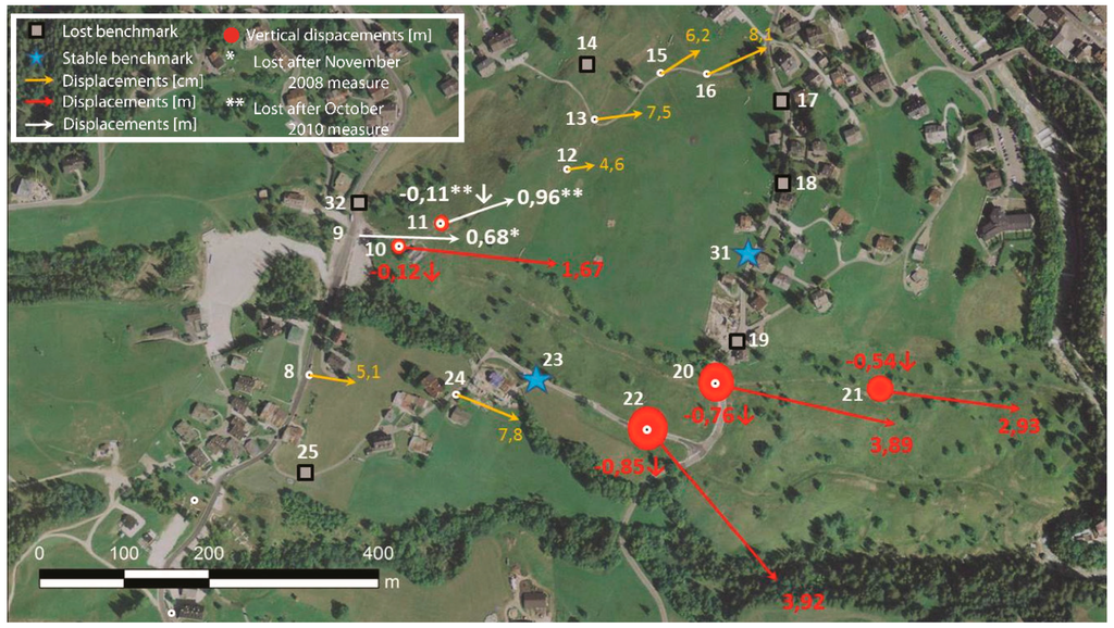 Data clearly show the presence of areas of larger activity, with velocities in the order of m/year, and others where the displacement rates are much lower, around cm/year. The southern landslide, where the village of Mortisa lies, shows lower displacement rates than the northern one. These results are coherent with the geomorphological evidence (Figure 5).