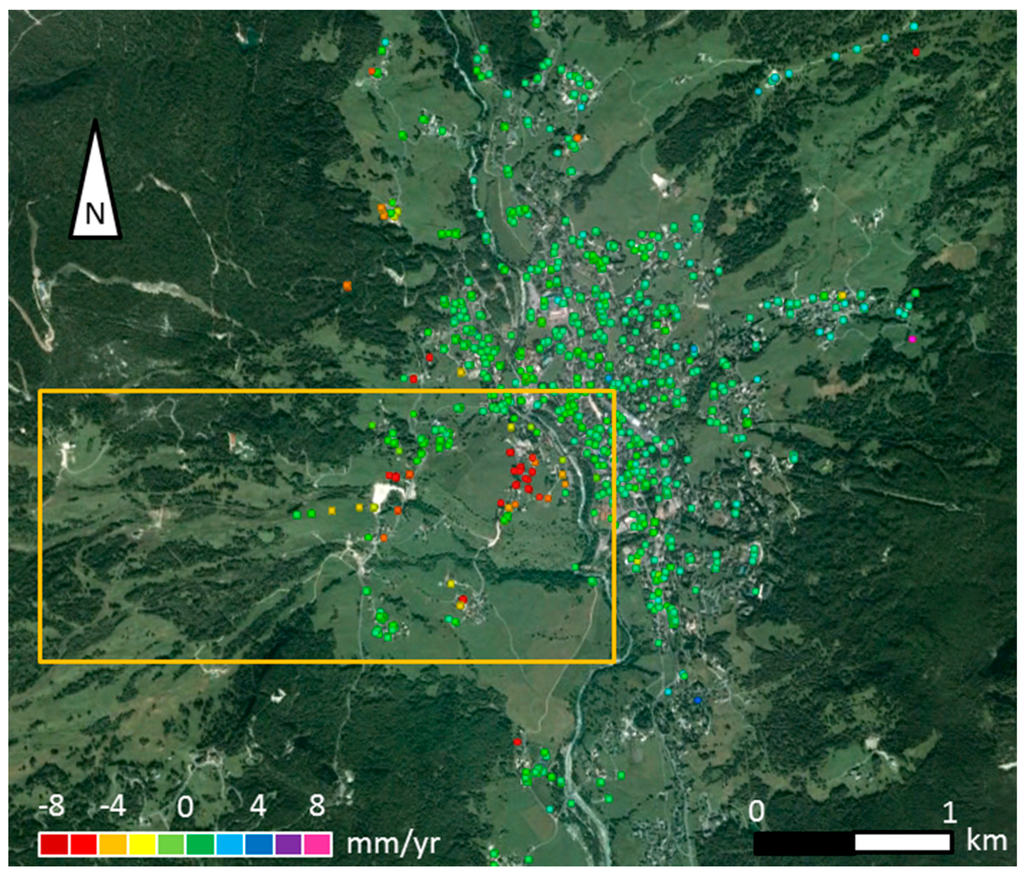 Results of the interferometric point target analysis (IPTA) processing on the ENVISAT dataset (2004–2010). In the orange rectangle is the study area.