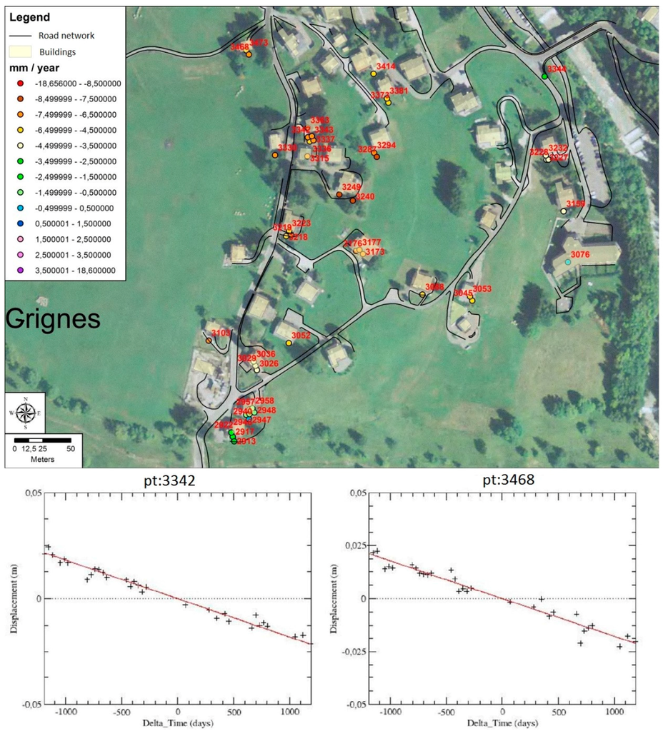 The displacements were also analyzed at a smaller scale to estimate the movements of the settlements. In Figure 8 an example for the village of Grignes is illustrated, where most of the buildings are moving. In this area, no geomorphological evidence was suggesting the presence of displacement, and GPS measurements—due to accuracy issues and to the loss of most benchmarks—were not detecting movements. However, the landslide is also active here, as A-DInSAR data clearly show; the displacements are mostly lower than a cm/year, which is still enough to damage poorly designed and maintained infrastructures on the long run. This is especially true for linear facilities like drainage systems and waterworks; therefore, the information on the presence of displacements is valuable for the local authorities.