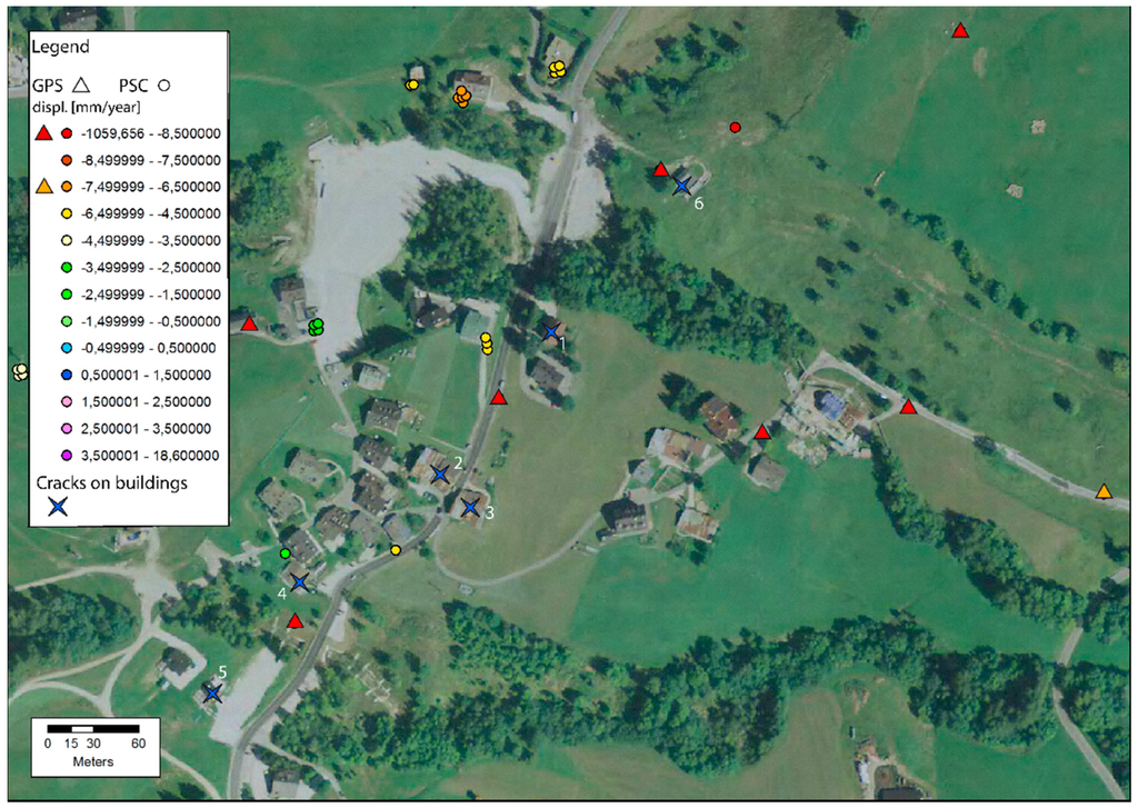 In Figure 9 an example of the data provided to the municipality is shown. The different degrees of displacements in the slope can be appreciated in great detail: this is an indication of the conditions and the risk to which every single structure is subjected. The map shows that buildings 1–5 are placed in relatively safe areas. Correspondingly, they present only small cracks that do not affect the overall safety of the structure. Moreover, the cracks of houses 2 and 3 are probably due to the age of the building rather than by the small and uniform displacements recorded. Building 4 is close to the border of a highly active area along the stream but the margins of the slide seems well defined and not endangering the structure.