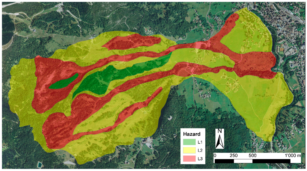 This study shows that in order to be able to design a sound local-scale hazard map, numerous measures which are to be carried out in a long time span and with different instruments are absolutely mandatory. This is particularly true for urban areas where the absence of damage on buildings could lead to overestimation of the stability of the zone and where human activities in the surrounding fields (mechanical cutting of grass, ski slopes maintenance work) easily obliterate some geomorphological features, especially for slower phenomena. The fact that the map is rigorously data-supported limits controversy between land owners and local authorities.