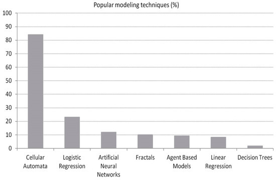 As Figure 1 indicates, a wide variety of algorithms has been incorporated in urban growth prediction models (UGPMs) with cellular automata tested in the majority of the reviewed manuscripts [43]. Subsequently, these theoretical approaches found real world implementations. A large number of applications have incorporated CA for UGPM development using real data [20,27,43]. A combination of CA with Markov models has also appeared in multiple studies [38,44,45,46].