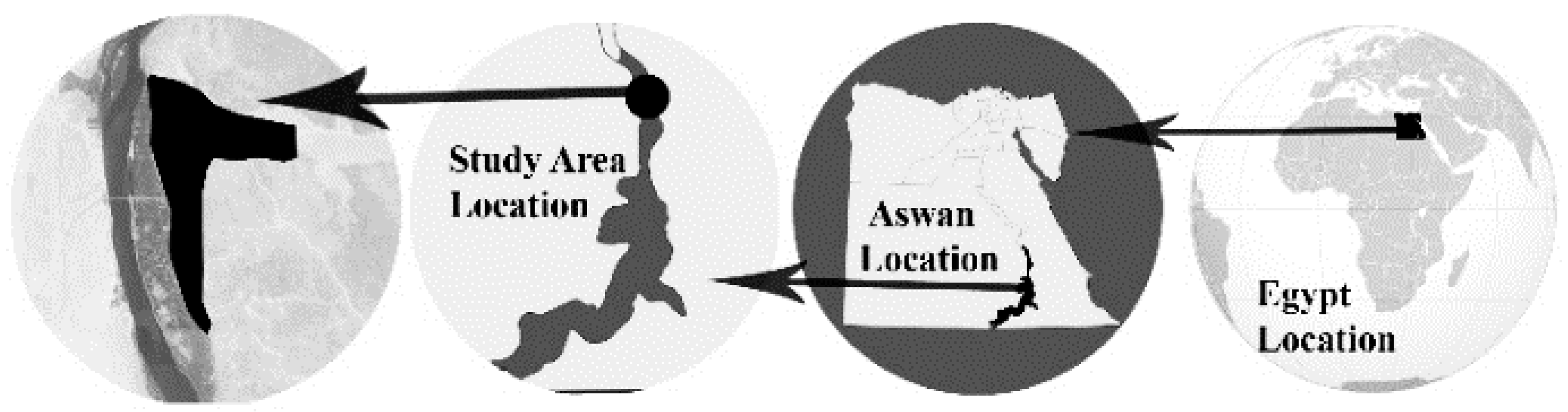 The study area (northern Abouelreesh village) is located in the province of Aswan, in southern Egypt. It lies between longitudes 32°52’E and 32°55’E and latitudes 24°10’N and 24°14’N. The study area is bordered to the east by mountains and from the west by an agricultural region, and the Nile River. Figure 2 shows the location of the case study area location in relation to Egypt and the rest of the world. The area of urban development approved for northern Abouelreesh in 2010 was ∼453.01 acres.