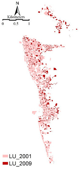 The official detailed plan for the study area was created in 2009 by The General Organization of Physical Planning (GOPP). The detailed plan was updated in 2014 by using Google Earth to manually extract the relevant data to the year of building construction. This was followed by a visual analysis of high-resolution aerial images of the city in Google Earth [58]. Figure 4 shows the land use in 2001 and 2009.