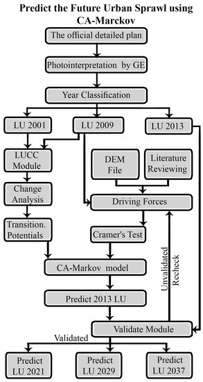 This study uses the land change modeler for ecological sustainability. The land change modeler is an integrated software module in IDRISI® Selva that performs land change analysis, change prediction, and habitat and biodiversity impact assessment [52]. Land use and cover change (LUCC) has become one of the key issues in global change research [17]. The land change modeler can be considered as a good modeler to that applied the integrated model between LR, MC, and CA. Use of such a model also provides a better understanding of the functions of the land use systems, and the support needed for planning and policy-making. Our methodology is presented in the following, which explains the steps of the framework of future urban sprawl prediction.