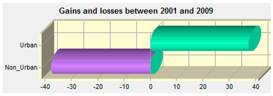 The Change Analysis panel provides three graphs of land cover change between the two land cover maps specified in the Project Parameters panel. One can view these graphs in a variety of units (cells, hectares, square kilometers, acres, square miles, % of change and % of area). Note that changing the units on this panel causes the units on the Change Maps panel to also change, and vice versa. Figure 6 shows the gains and losses between 2001 and 2009, more than 37 ha transfer from non-urban to urban areas. Figure 7 shows the urban sprawl in year 2009.