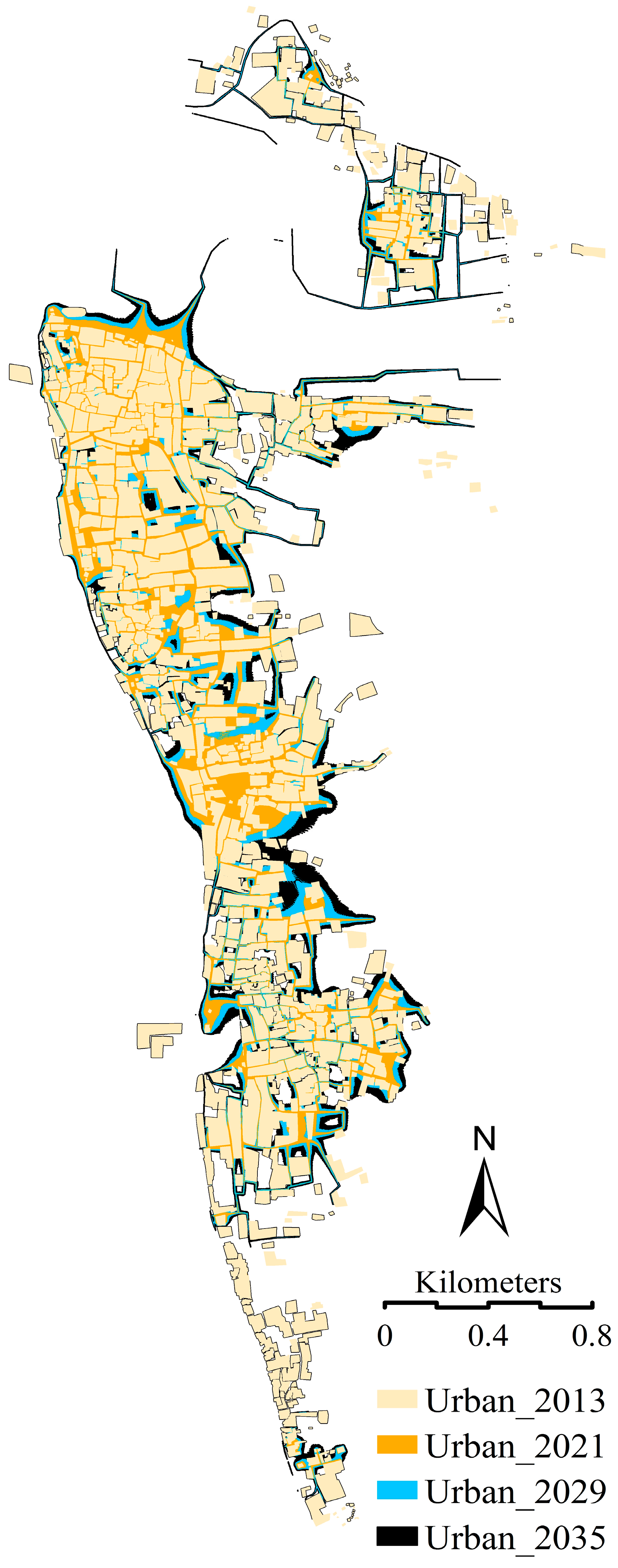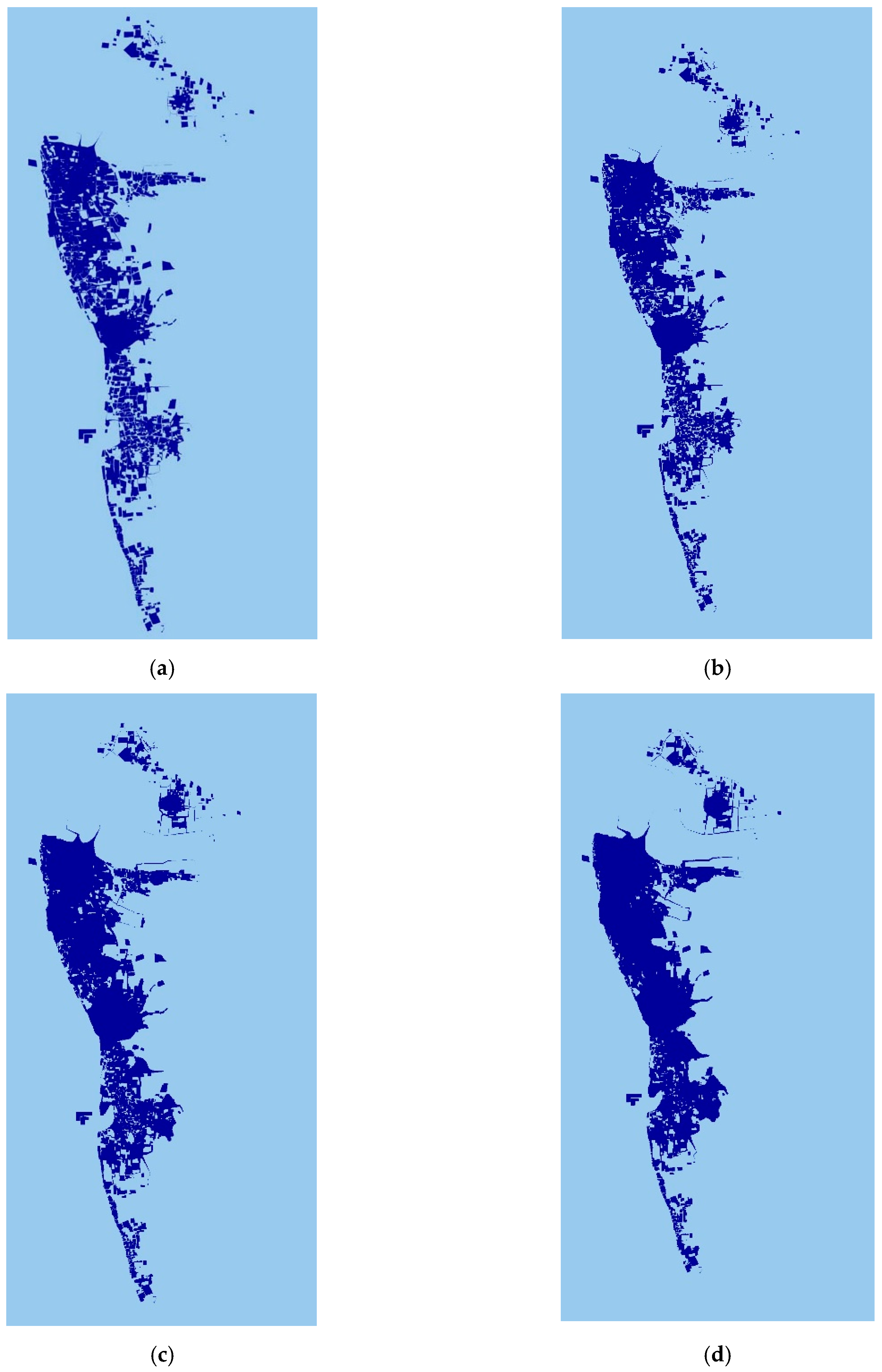 The increase of urban area 2013–2037. (a) Urban 2013 (1.85 km2); (b) Urban 2021 (2.02 km2); (c) Urban 2029 (2.31 km2); (d) Urban 2037 (2.59 km2).