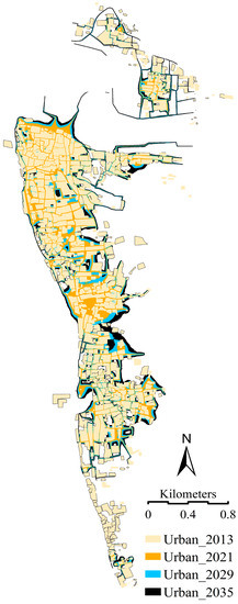 The increase of urban area in our research zone gradually increased over the 24-year simulation period. The urban area in 2013 was 1.85 km2 and increased to 2.02 km2 for 2021, then jumped to 2.31 km2 for 2029 and ultimately reached 2.59 km2 for 2037 as shown in Figure 9a–d and Figure 10.