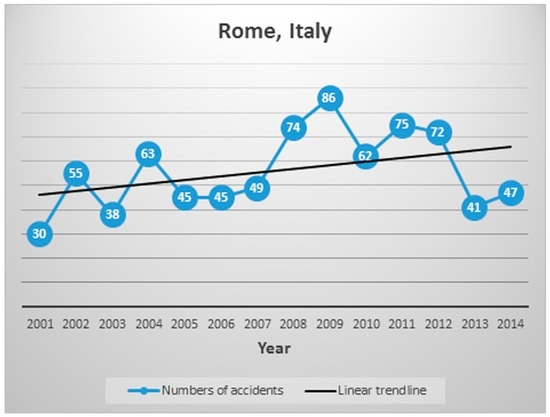 In recent years, with the increasing number of cars, motorbikes, and bicycles circulating in the cities, vehicle accidents and injuries attributed to cracks in asphalt caused by root growth and fallen trees are now on the rise. An example is the Italian capital city of Rome. Data derived primarily from the Italian National Institute of Statistics (Istat) [22] shows that the number of car and motorbike accidents on municipal roads increased from 2001 to 2014 in Rome. A recent official report from the Municipality of Rome [23] identifies the most dangerous roads. In particular, there is a significant trend for the number of accidents with injured and deceased victims that involved trees falling along the roadside, and where roots have cracked or lifted the asphalt pavement (Figure 1).