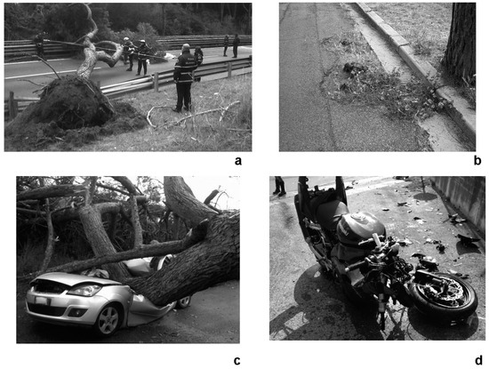 Recent examples of serious crashes with victims where falling trees (a) or root cracks (b) have been the responsible agent of injury, death, or vehicle damage (c,d) on the roads of Rome.