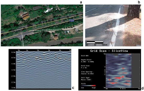 This figure shows the area of investigation along the SS8bis (a), with damage to asphalt due to the pine root growth and pavement uplifting (b). Several hyperbolic events and red elongated anomalies within the first 0.4 m on both the radargram (c) and depth slide map (d) are due to the root architecture beneath the asphalt.