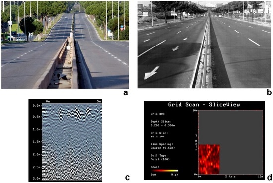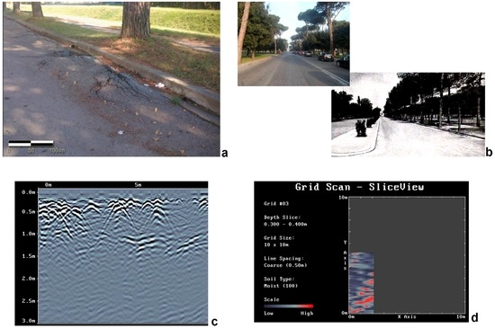 Figure 4 illustrates the results of a GPR investigation along one of the most congested and dangerous main roads in the city of Rome: the SS8bis. As shown in Figure 4, mature pine trees are growing in close proximity to the road infrastructure, creating a critical condition for root development. As a consequence, the asphalt surface is cracking and bulging, creating uneven surfaces that are very unsafe for cars, motorbikes, bicycles, and pedestrians.