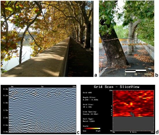 The upper images illustrate the critical situation of the plane trees between the embankments of the Tiber River and Lungotevere Street (a,b). The lower images illustrate the GPR results collected around the leaning tree (c,d) and highlight critical conditions in the first 0.3 m beneath the pavement. Note that the grey area in (d) represents the area with no GPR data parallel to the embankment.