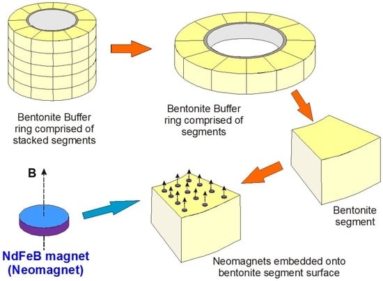 The principle of using magnets as a monitoring system is illustrated in Figure 1, which depicts a bentonite buffer “sleeve” located around an individual HLW (High Level Waste) canister and overpack, simplified from the Swedish KBS-3V (vertical waste deposition site) GDF design concept [,]. Using neodymium (Nd) magnets (“Nd-Fe-B magnets”) as an example, arrays of small, oriented magnets can be embedded on pre-pressed bentonite segments that have appropriately-sized depressions in their upper surfaces to accommodate the magnets without increasing void space. The example in Figure 1 has 12 such magnets embedded on one bentonite segment.