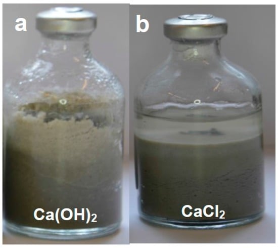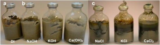 In summary, the analysis of the bentonite matrix shows that the changes are mainly related to the initial composition of the solution rather than the presence and type of synthetic magnet. The principal changes, formation of Ca-montmorillonite (in Ca(OH)2 and CaCl2 solutions), or K-exchanged montmorillonite (in KOH or KCl solutions) do not have an influence on the overall swelling behaviour of the bentonite clay matrix. Some Fe-enrichment of the bentonite matrix in the surroundings of the magnets cannot be excluded [], but any such Fe enrichment did not lead to the formation of non-swelling materials, such as chlorite, under the conditions investigated.
