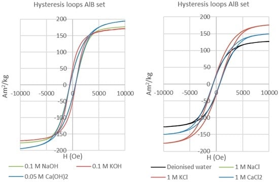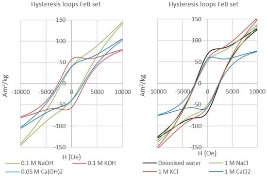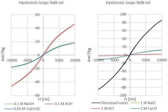 Hysteresis loops (magnetisation vs applied field) of NdFeB permanent magnets reacted with alkaline solutions (left), deionised water (right), and saline solutions (right). The sample reacted with a KOH solution features a slightly wider hysteresis loop, typical of a pseudo-single domain material, whereas all other hysteresis loops show the classic “wasp-waisted” shape of a superparamagnetic material.