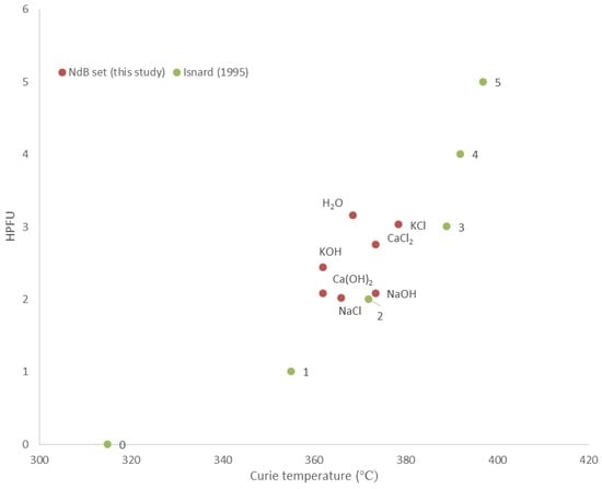 HPFU (hydrogens per formula unit) vs. Curie temperature plot. The samples of the NdB set, in which HPFU has been calculated from powder X-ray diffraction (PXRD) spectra, are plotted and compared with pure NdFeB hydrides (Isnard, 1995 []: points 0, 1, 2, 3, 4, and 5). The relative scatter of the samples from this study reflects their impure chemical compositions which causes shifts in temperature.