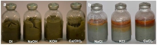 Post-extraction picture of the samples of AlB set. (a) Samples reacted with deionized water and alkaline solutions, showing complete swelling of the bentonite matrix, with formation of tensile fractures; (b) The three samples reacted with saline solutions, showing abundant quantities of red/orange precipitates at the solution/air interface and at the solution-bentonite interface. The bentonite matrix is not completely swollen and presents an orange colour at the interface, gently fading towards a yellow/pale-olive-green colour towards the basal part of the matrix.