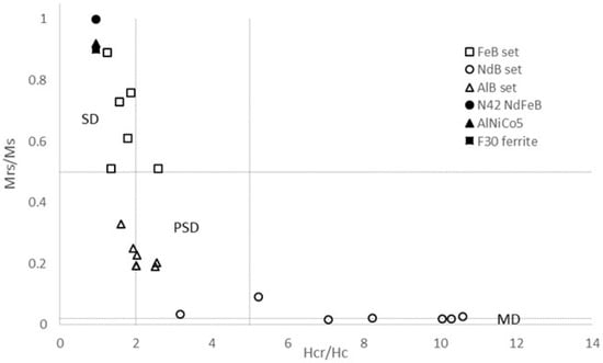 The key magnetic signatures of magnets from all experiments are depicted on the Day/Dunlop plot [] of Figure 9. This plot allows discrimination of the domainal state of the magnets based on their hysteresis and backfield parameters.
