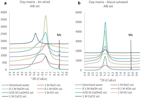 (a) Air-dried and (b) glycol-solvated PXRD traces of clay samples from the AlB set. The 2.4–10°2θ range is chosen to emphasise the changes occurring to the 001 diffraction peak. (Ms: muscovite).