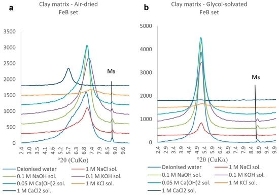 (a) Air-dried and (b) glycol-solvated PXRD traces of clay samples from the FeB set. The 2.4–10°2θ range is chosen to emphasise the changes occurring to the 001 diffraction peak. (Ms: muscovite).