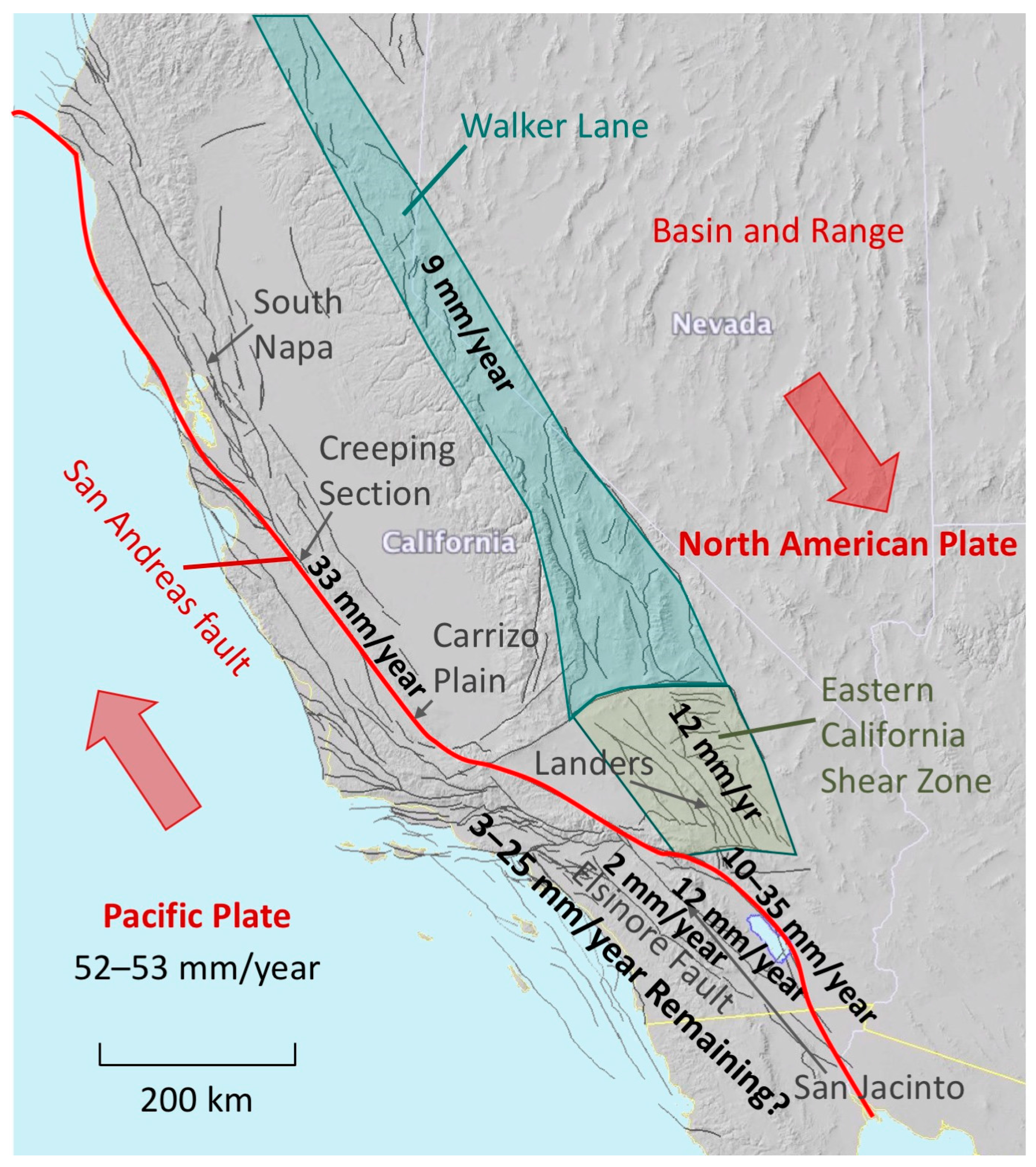 The Pacific and North America plate boundary accommodates a total relative plate motion of 52–53 mm/year [3,4]. The San Andreas fault (red line onshore) takes up most of the plate boundary motion of up to 66%. About 25% of the plate motion is accommodated by the Eastern California Shear Zone in the Mojave Desert [4] and the Walker Lane to the north [5], leaving 9% to be accommodated elsewhere. Estimated slip rate along the southern San Andreas fault has a wide range, representing substantial uncertainty. The estimated slip rate along the San Jacinto fault varies, but in this example we use 12 mm/year [6,7,8]. Slip rate along the Elsinore fault is approximately 2 mm/year [9] leaving a remaining 3–25 mm/year of deformation south of the Central and Western Transverse Ranges to accommodate the total plate motion. Numerous faults take up the entire plate boundary motion and the rates are more uncertain than the simplified model shown here.