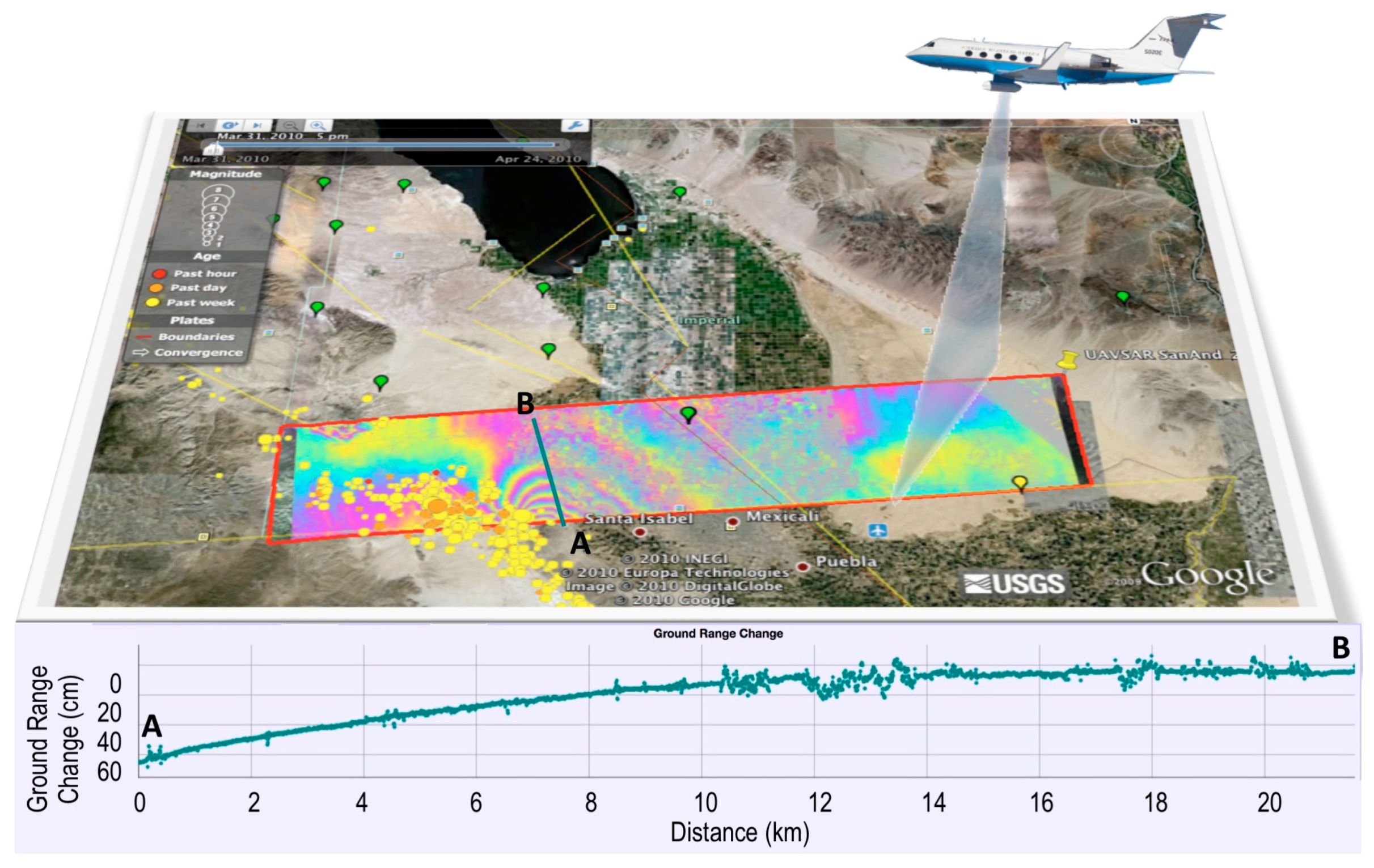 UAVSAR concept showing the airborne instrument. The oblique image is of the Salton Trough in southern California. The south (bottom) edge of the UAVSAR image lies at the US–Mexico border. The yellow dots represent aftershocks from the 2010 M7.2 El Mayor–Cucapah earthquake. The Salton Sea is shown at the north end of the image bounds the Imperial Valley. The width of the swat is about 15 km. The lobes of fringes represent about 60 cm of differential motion in the crust north of the main rupture as shown by the extracted ground range change in the profile plot with the location noted on the interferogram [38].