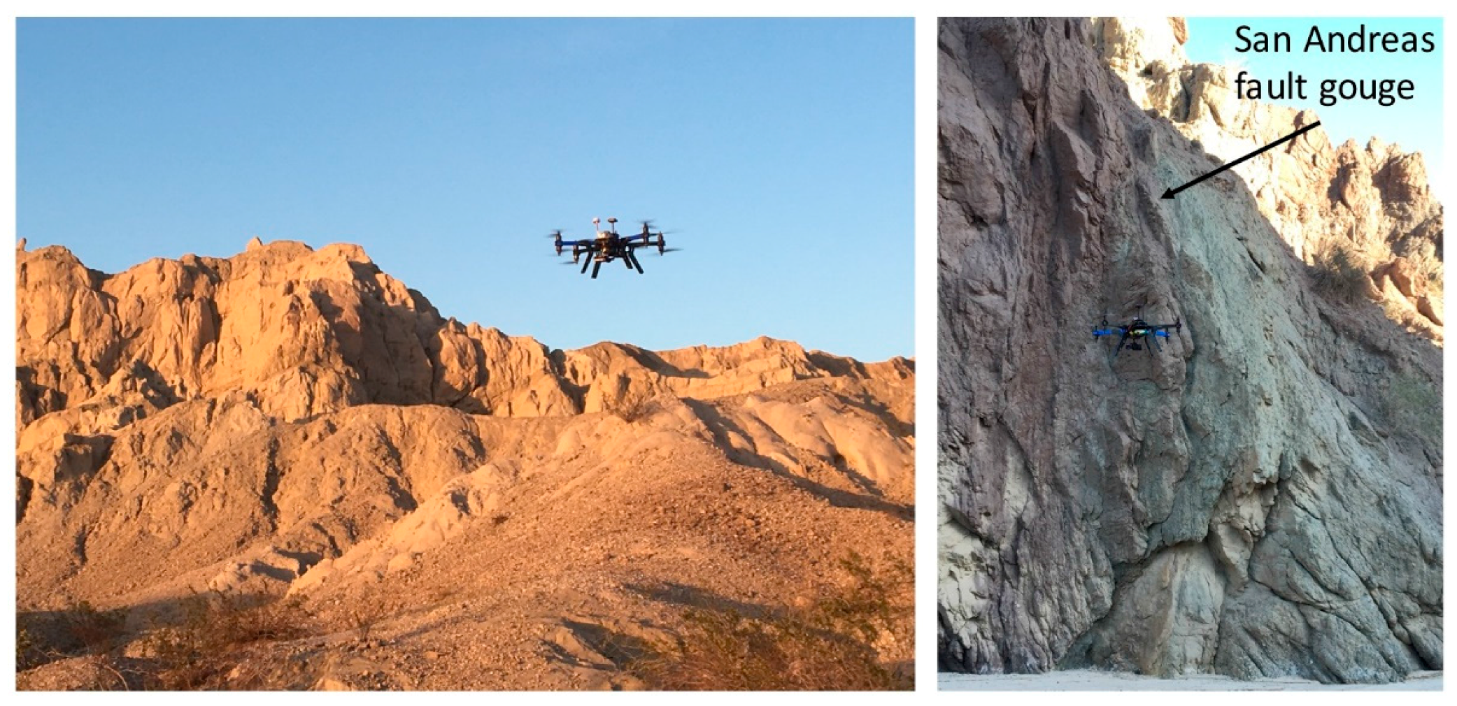 Example flight of a small unmanned aerial system (sUAS): in the Mecca Hills (left); and in Painted Canyon (right), acquiring low-altitude photos and to apply Structure from Motion along the San Andreas fault. The sUAS can image steep slopes to create topographic reconstructions with comparable horizontal and vertical resolution.