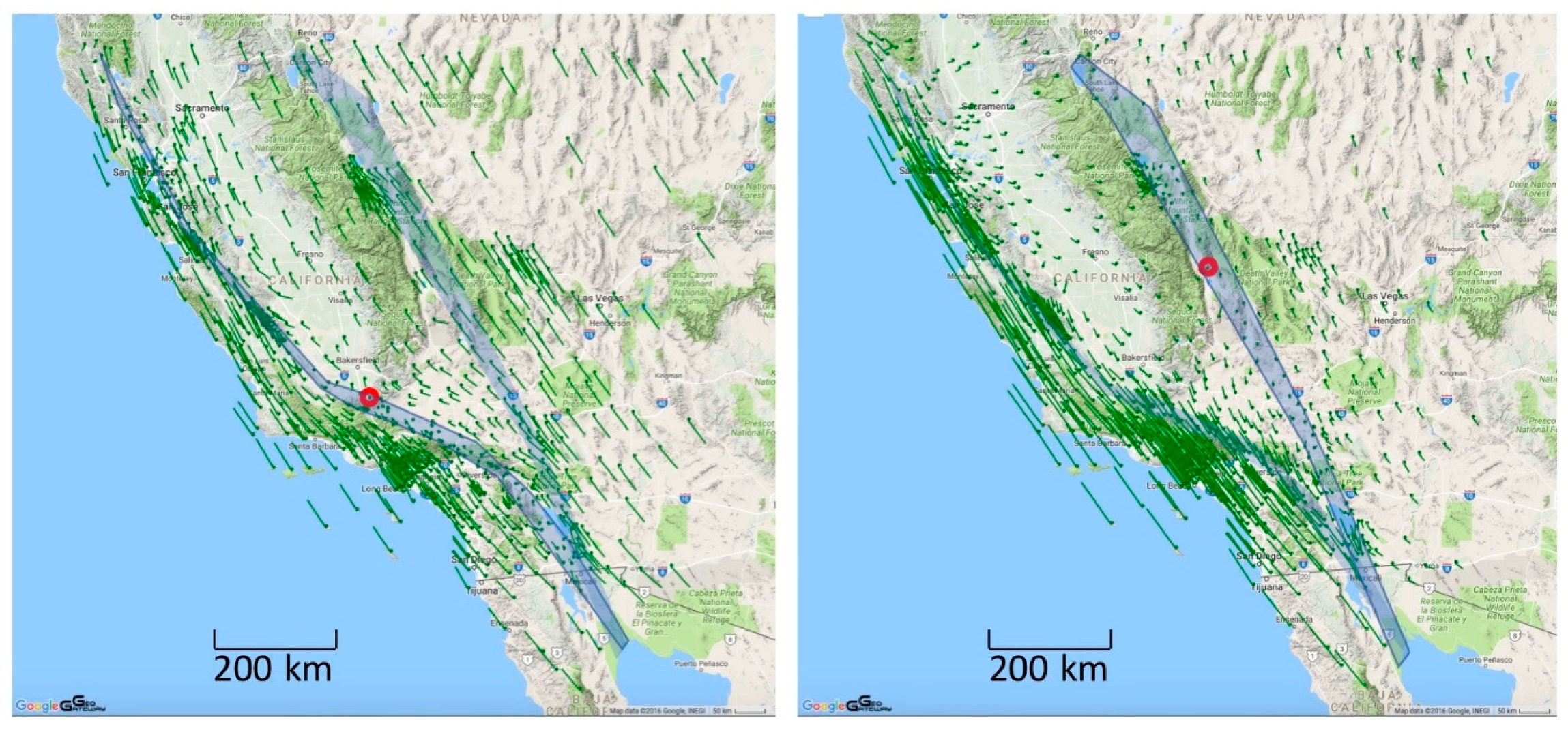 Global Positioning System velocity vectors are plotted relative to two different stations using GeoGateway [69,70]. Stations are marked by a small circle and a line with no arrowhead represents the velocity vector. Left panel shows velocities relative to station EDPP [71] near Tejon Pass noted by a red circle. Right panel shows velocities relative to station P093 in the Owens Valley, also noted by a red circle. The dividing region between northward and southward vectors was drawn in for: the San Andreas fault (left); and Eastern California Shear Zone/Walker Lane (right), and then plotted on each map.