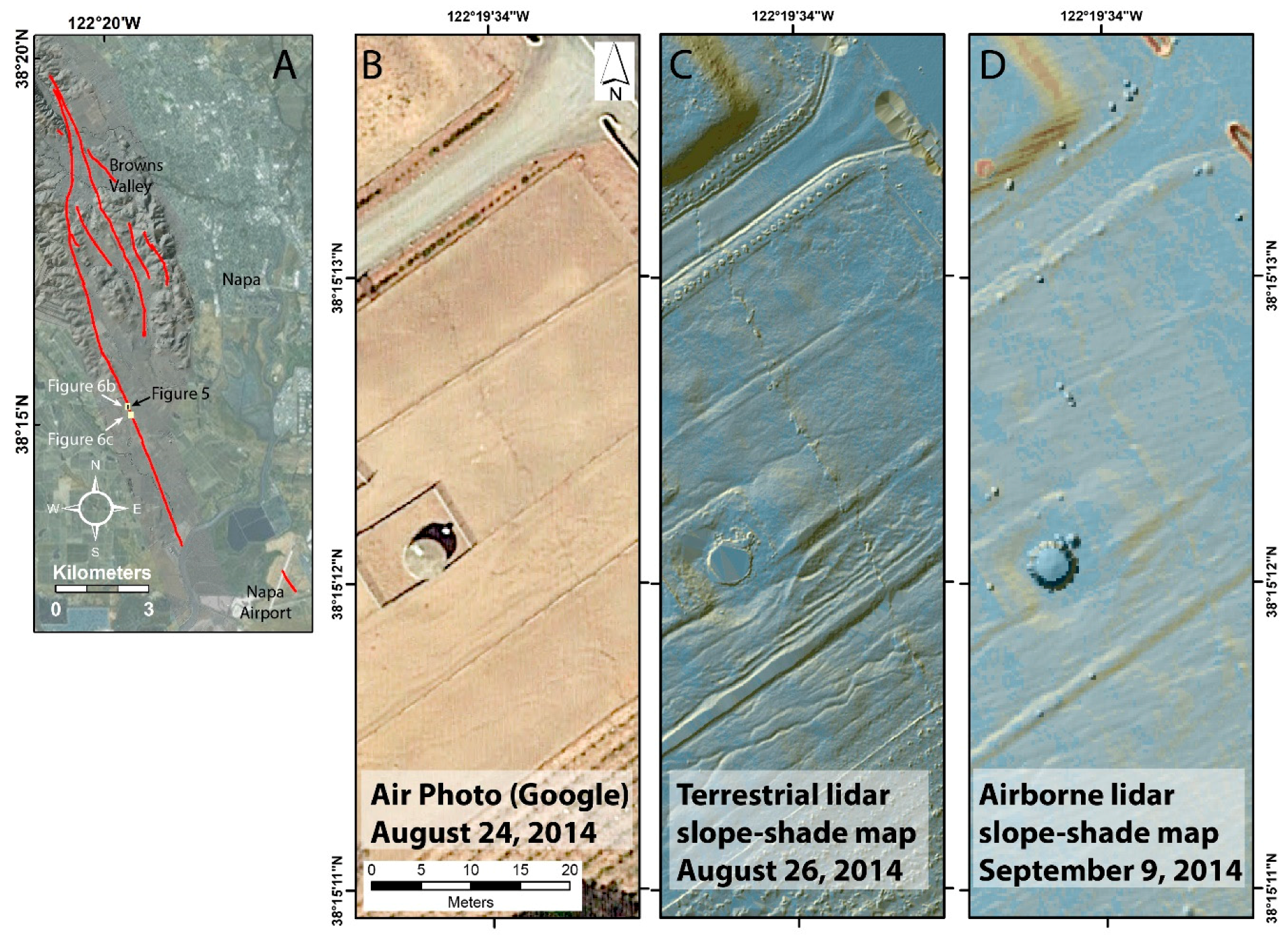 Images from 2014 South Napa Earthquake: (A) map of surface rupture with location of zoomed panel; (B) orthorectified air photos with ~30 cm pixel resolution collected the day of the earthquake by Google; (C) slope-shade map with 2.5 cm pixel resolution made from a digital elevation model generated from an ultra-high resolution 3D point cloud (>1000 points/m2) from a terrestrial laser scanner; and (D) slope-shade map with 25 cm pixel resolution made from a digital elevation model generated from a high resolution (~20 points/m2) 3D point cloud from an airborne laser scanner survey. Figure modified from [43]. In each panel, the rupture cuts the image from the lower right corner up towards the upper left corner.