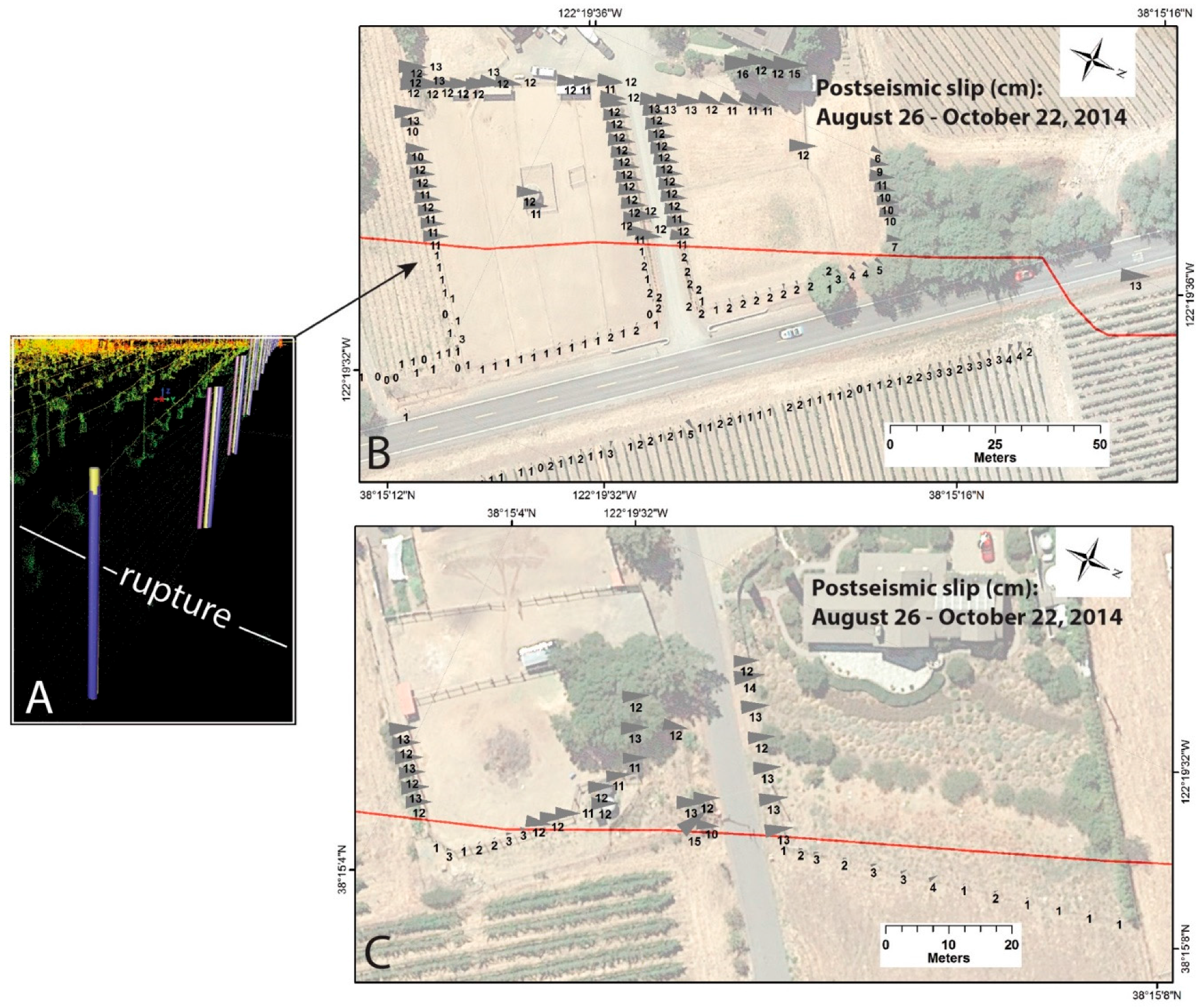 Postseismic deformation associated with 2014 South Napa earthquake as measured using objects in terrestrial lidar point cloud. (A) Cylinders modeled from fence posts in point clouds at three times post-earthquake, and 3D point cloud of vineyard rows in background. Note the progressive dextral offset relative to the fencepost in the foreground. (B,C) Display direction (grey arrow) and amount of translation of objects in the study area (as indicated by the size of the arrows and their labels), which are translation distances in cm. Red line indicates the generalized trace of the 2014 surface rupture. Base image is aerial photograph taken 24 August 2016 by Google. Figure modified from [67]. Study area locations are shown in Figure 5.