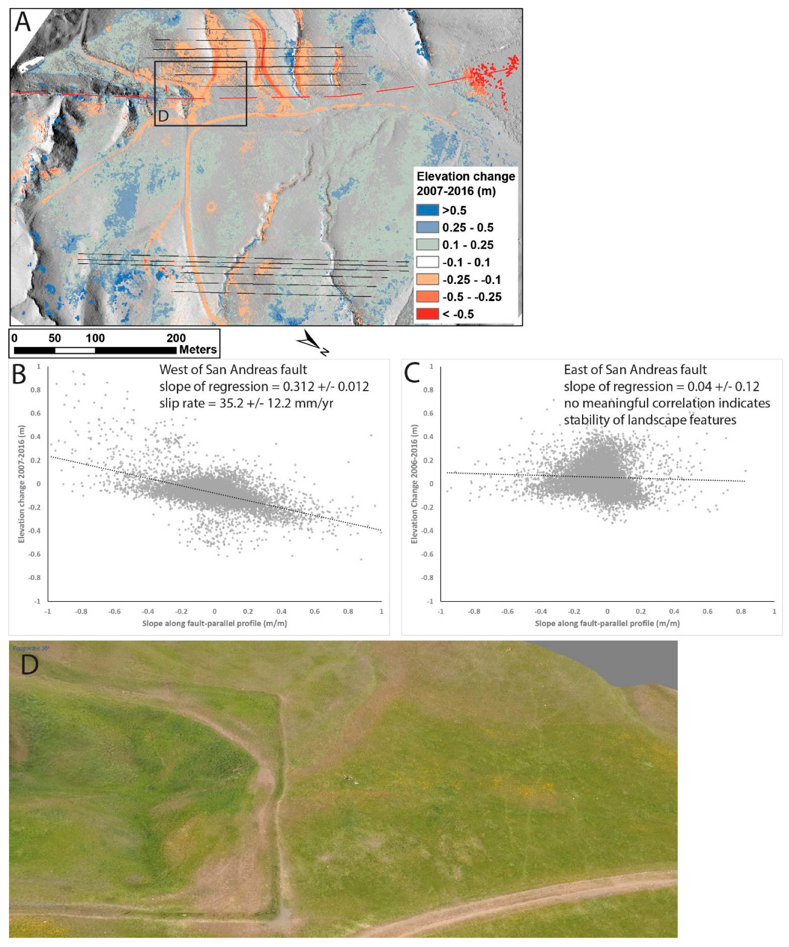 Rapid slip rate estimation from topographic change. (A) Map of elevation change from 2007 to 2016. This map displays vertical difference between 2007 airborne lidar and 2016 terrestrial lidar determined in a east-side-stable reference frame. Red indicates elevation decrease. Elevation decrease along south-facing slopes on west side of fault (top of figure) and elevation increase along north-facing slopes on west side of fault indicate dextral motion. (B,C) Plots of local fault-parallel slope versus elevation change on west and east sides of fault, respectively. These are taken from six fault parallel profiles on each side of fault as mapped in (A). For relatively smooth slopes and small slip magnitudes, the relationship between slope along a profile in the direction of fault motion and the vertical difference in elevation at that point at two times indicates the amount of horizontal movement. In this case, the slope of the regression line of slope versus elevation change along several fault-parallel profiles provides the amount of interseismic creep on the San Andreas fault from 2007 through 2016. In this case, the apparent horizontal offset is 0.312 ± 0.12 m over nine years, indicating a slip rate of 35.2 ± 11.2 mm/year, consistent with the higher end of previous estimates [81]. (D) 3D topographic model from sUAS-derived Structure from Motion photogrammetry. A fence offset by aseismic slip on the SAF is clearly visible just left of center. The fault cuts from left to right through the middle of the image.