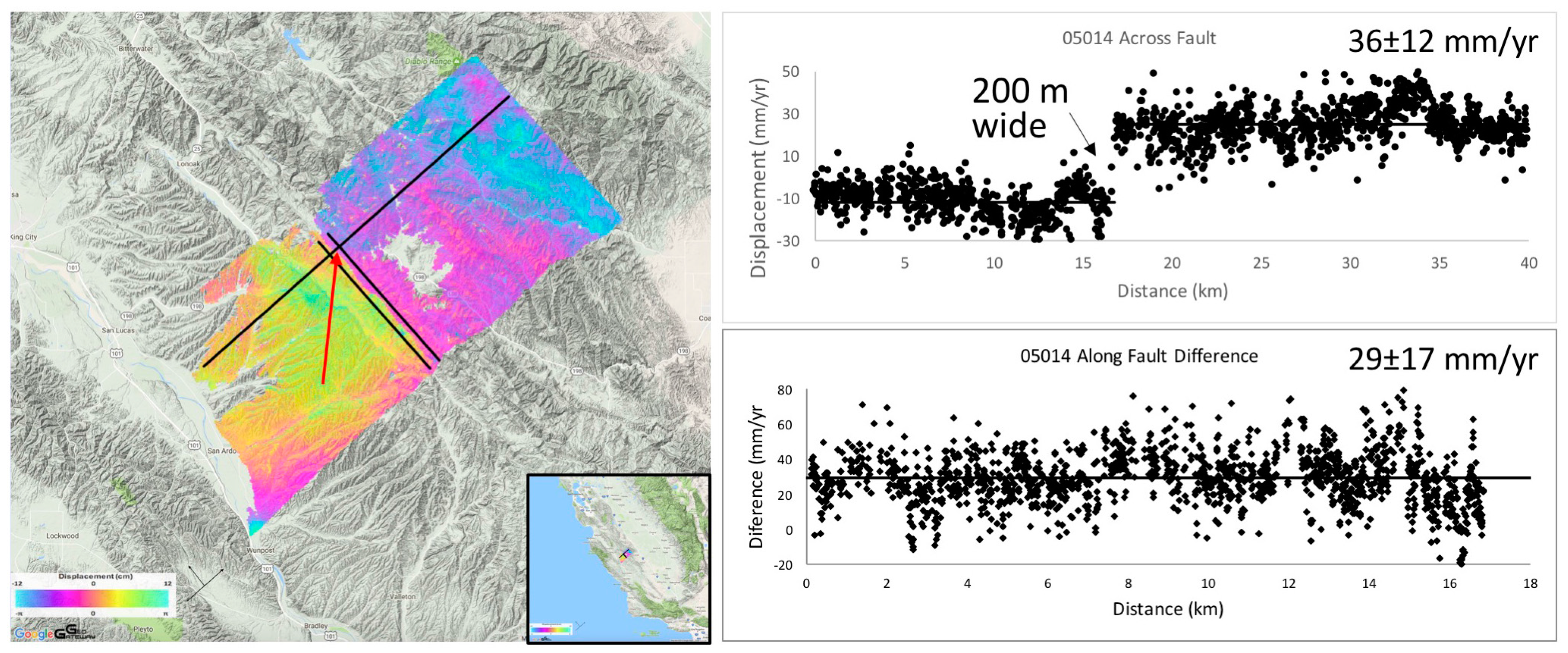 The 175-km long creeping segment of the SAF from Parkfield, California in the south to San Juan Bautista in the north is thought to prevent rupture propagation from the southern SAF to the northern SAF, effectively limiting the possible moment release on the greater San Andreas System. However, the possibility of significant coseismic moment release along the creeping segment remains a point of discussion in the literature [76,77] and is included in seismic hazard models, albeit with low probabilities [1]. As such, it remains critical to determine the distribution of relative plate motion across the SAF system along this fault section. This requires measuring and mapping the spatial and temporal distribution of aseismic slip in order to identify any slip deficit that might indicate potential for coseismic moment release. Aseismic slip rate varies along the creeping segment and also when measured over different apertures [78,79], but these measurements alone do not allow for proper slip partitioning onto mappable structures and/or distributed deformation [80]. Detailed fault mapping from field [81] and remote sensing (lidar) mapping [82,83] begin to explain the nature of the fault in a particularly complex zone of distributed faulting. Deformation may be accommodated along the creeping SAF as discrete fault offset only or with additional distributed deformation [80]. The question of whether plate boundary motion is accommodated as distributed deformation or accumulated as elastic strain or fault zone slip is fundamental to understanding rupture propagation and potential earthquake magnitude in central California. However, these studies do not constrain the motions or properly partition aseismic slip across multiple structures and/or measure distributed deformation between mappable structures. This can be addressed by combining UAVSAR, GPS, and collection of new geodetic imaging from sUAS and lidar platforms.