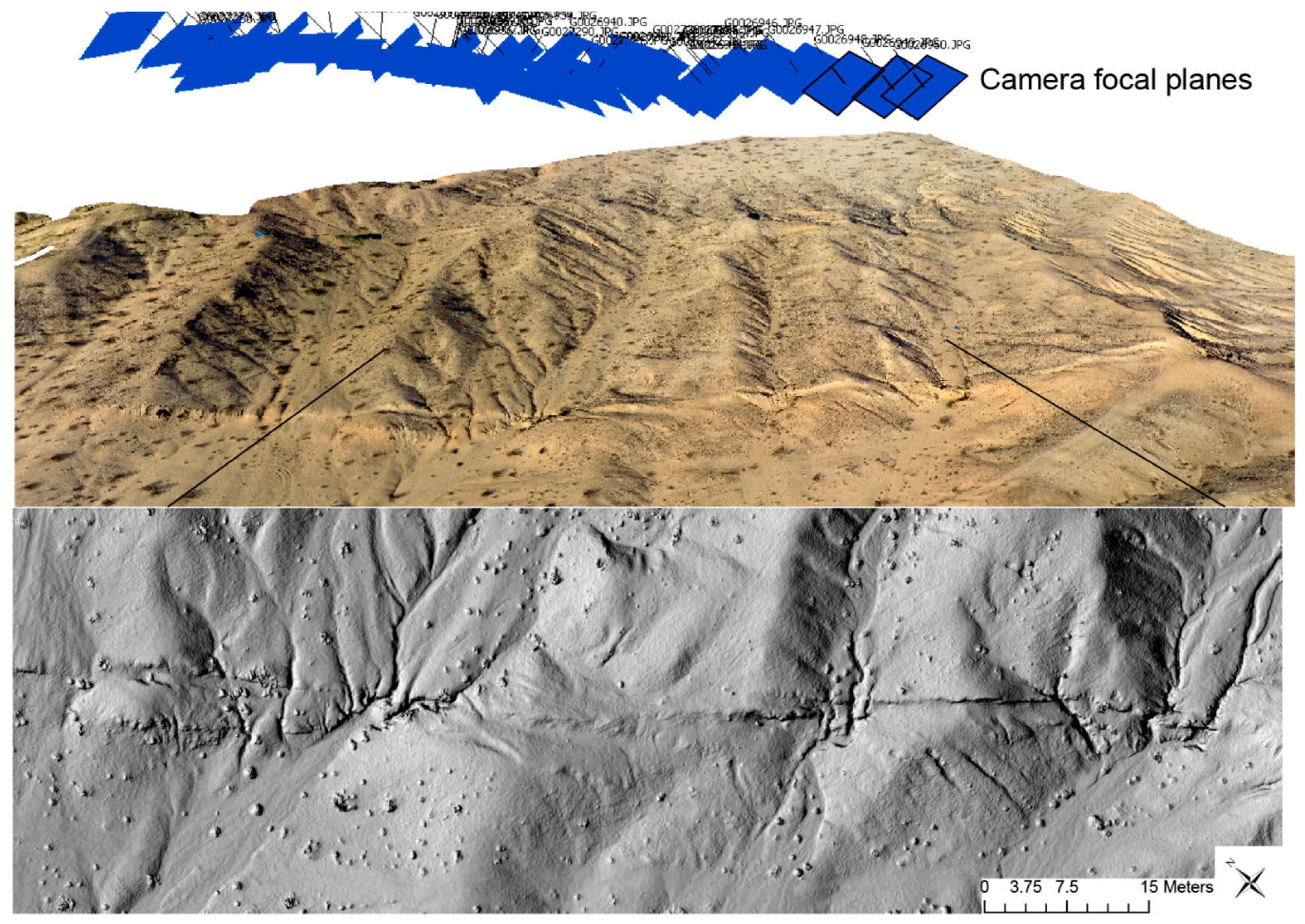 The advent of inexpensive digital cameras, sUAS, and fast computer processing power has enabled rapid growth in modeling three-dimensional structure from photographs. Using SfM, images can be combined to solve for surface topography (e.g., [20]). Advantages of SfM over traditional airborne stereo imaging is the ability to image steep slopes, to capture topography from a wide range of sensors without detailed flight planning and the ability to resolve very fine-scale features (Figure 3). Structure from motion also produces colored 3D models from the imagery, which can provide information about lithology and surficial characteristics (e.g., vegetation, moisture, texture, structure).