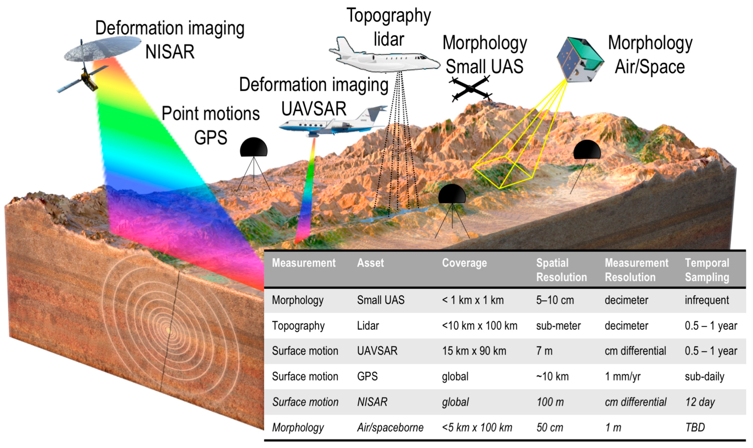 Several methods exist to measure velocities and strain rates at or near the surface of the Earth. We focus here on characterization of crustal deformation using geodetic measurements from GPS, airborne radar interferometry, and high-resolution topography from multiple collection platforms. Other methods used to characterize crustal deformation include spaceborne InSAR, leveling, triangulation and trilateration, borehole or laser strainmeters, and paleoseismology. The measurements are used to infer processes at depth by inverting the data or constructing forward models. For topographic measurements, we focus on ground and airborne lidar and Structure from Motion (SfM) photogrammetric measurements from small sUAS [20]. These measurements are complementary, capturing a wide range of spatial and temporal scales of crustal deformation and landscape evolution.