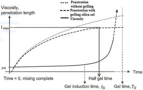 The relationship between gel induction time, half gel time, and the maximum possible penetration length, is shown in Figure 1 [5]. An earlier literature review has defined a gel induction time tG, as the time at which a marked increase in viscosity occurs, for example, when the initial viscosity has doubled [5]. However, in this paper, a gel induction time has been defined as the point of intersection between the storage and the loss moduli. The gel time TG, is defined as the time at which the grout is deemed to have set, using the needle insertion technique described below. Half of the gel time is therefore the midpoint between the initial time of mixing the colloidal silica and accelerator, and the gel time; Imax is the maximum penetration that can be achieved at half of the gel time.