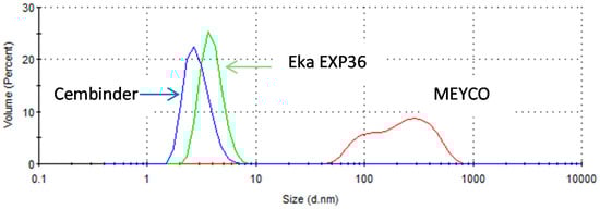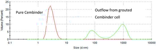 The size distribution by volume of pure Cembinder and the outflow solution from a grouted Cembinder cell.