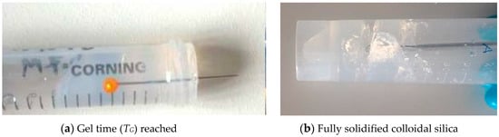 Test tube methods were employed in order to understand the gelling mechanism and the approximate gel time relationship with accelerator concentration. It was found that, after addition of the accelerator, the grouts show a viscous phase, during which the viscosity of the grout becomes significantly higher than that of the initial silica sol; this viscous phase lasts for some time, until the grout becomes completely solidified, after which, local fractures occur upon insertion of a needle, as shown in Figure 4.
