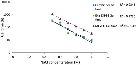 The gel times are plotted with respect to the NaCl concentration, as shown in Figure 5. It was found that the logarithm of the gel time shows a strong linear relationship with NaCl concentration (R2 > 0.93). At 20 °C, Eka EXP36 generally gelled the fastest, closely followed by Cembinder, whereas MEYCO MP320 had the longest gel time, by a factor of as much as ten. The difference in gel times is likely to be the result of the different size distributions and the differences in chemical stabilities of the three colloidal silica sols. The equations of the best log-linear fits for the colloidal silica gel time are tabulated in the conclusions section.