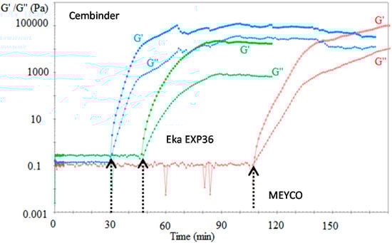Before the gel induction stage, the loss modulus dominates the fluid properties, and the storage modulus is infinitesimally small, until a point is reached at which the storage modulus suddenly shoots up, becoming higher than the loss modulus. The point of intersection between the storage and loss modulus is defined as the gel induction time (see indicative arrows in Figure 5).