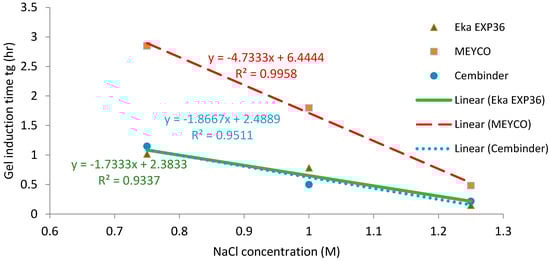 Figure 7 presents the gel induction time (tG) with respect to the concentration of NaCl, at 0.75 M, 1 M, and 1.25 M. It was found that, when the NaCl concentration exceeded 1.25 M, the storage modulus (G’) of the grout was higher than the loss modulus (G’’) from the start of testing (which was almost immediately after mixing), meaning that the elastic component became dominant from the time at which the sample was put in the rheometer, and so it was not possible to determine a gel induction time.