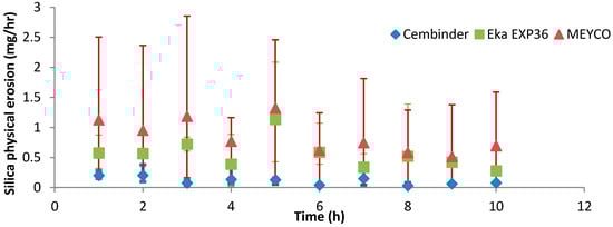 Figure 9 shows that, overall, MEYCO had the highest erosion rate (0.85 mg/h) and the greatest variability in the results; Cembinder showed the lowest erosion rate, of 0.11 mg/h. All experiments were run three times and Cembinder had the lowest variability of results, as well as the lowest erosion rate with 0.05 M NaCl solution. The chosen flow-rate is within the range of naturally occurring groundwater velocity, and the experiment suggests that Cembinder grout is the least likely to be removed under saline groundwater conditions in the geodisposal scenario, although further investigation is clearly required, and this work is in progress.