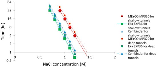 Amongst the colloidal silica selection criteria published by the Chalmers University of Technology, is a recommendation that the gel time should be controlled, so that it lies between 15 and 50 min [5]. This time is taken to be sufficient for allowing the mixing, pressurising hoses, and actual grouting, without excess grout consumption. For grouts with long gel times injected into fissures with flowing groundwater, grout injection must be continued until the grout is gelling, to prevent it from being washed out. Thus, grouts with long gel times require long grouting times [5], and so can involve high grout injection volumes. With this limitation, it follows that the operational time for deep tunnel grouting should be restricted to 10 to 33 min (i.e., two thirds of the gel time [5]. Therefore, for the grouts considered in the present study, the appropriate concentration range of the NaCl accelerator should be 1.5–1.7 M for MEYCO, 1.23–1.38 M for Eka EXP36, and 1.3–1.47 M for Cembinder, in order to achieve the desired operational time range. These times have been calculated by substituting the desired gel time range (15 to 50 min) into the gel time regression equations of Table 2. The overall NaCl accelerator and colloidal silica mixing guidelines for deep tunnel grouting, are tabulated in Table 2.