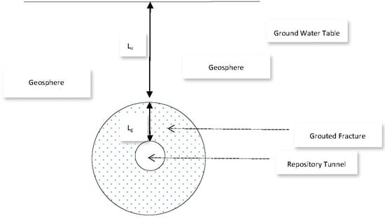 In order to ensure that any fractures in the surrounding rock are hydraulically sealed, we assume that an annular grouted zone surrounds the tunnel and lies between a tunnel diameter of 1.5 m, and the surrounding geosphere, at a diameter 12 m. If the vertical depth of the uppermost part of the grouted zone below the water table is Lu, and the annular width of the grouted zone is Lg, then the hydraulic pressure just above the grouted zone is g Lu. Here, is the density of groundwater and g is the acceleration due to gravity. The vertical hydraulic pressure gradient across the grouted zone is then: